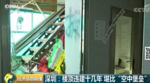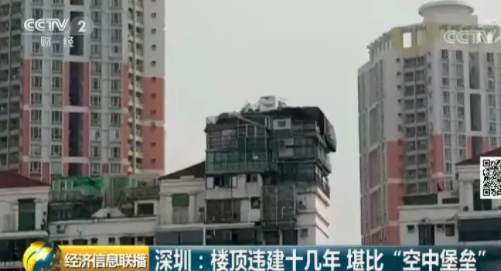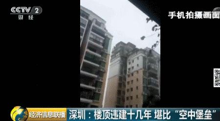 深圳福田區(qū)一個(gè)小區(qū)的居民日前爆料稱(chēng),小區(qū)一位業(yè)主違規(guī)在天臺(tái)上加建了幾層樓,遠(yuǎn)遠(yuǎn)看去就像一個(gè)“空中堡壘”,曾經(jīng)有人差點(diǎn)被上面掉落的鋼筋砸中,如此醒目的違建,已經(jīng)存在了十幾年。