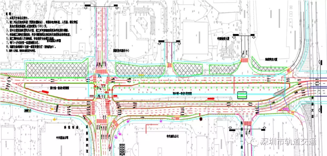由于深大站位于高新科技園附近,上下班期間人、車流量較大,為不妨礙正常交通,項目部決定利用科苑路西側(cè)2條現(xiàn)狀車道及東側(cè)5條新建車道對科苑路交通進行疏解,首先圍蔽車站東半幅進行地連墻及抗拔樁施工,并同步實施車站西側(cè)給排水改遷施工及西側(cè)2條新建車道疏解路面施工。