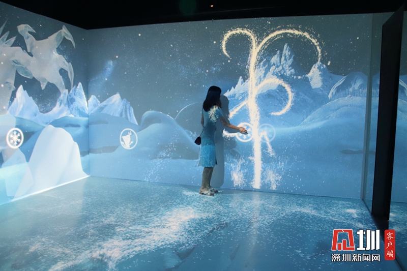 展覽還加入了體感偵測技術,冰山雪景隨著光影變換而變幻,就如同艾莎女王特別為粉絲們施展的冰晶魔法:足跡所到之處,雪花和冰晶變幻各種魔法特效,用手觸摸圓圈,還能在屏幕上升騰起一朵云,或者一串飛舞的雪花。艾莎女王、安娜公主和克里斯托夫也有可能現身在屏幕上