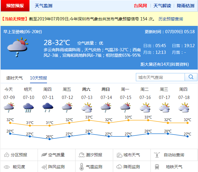 深圳新聞網2019年7月9日訊 近幾天,深圳天氣炎熱,有短時陣雨,白天最高氣溫達到31~33 ℃。預計9日有陣雨或雷陣雨,10~11日將有一次中到大雨局部暴雨過程,伴有雷暴和7~8級短時大風,炎熱天氣將有所緩解。