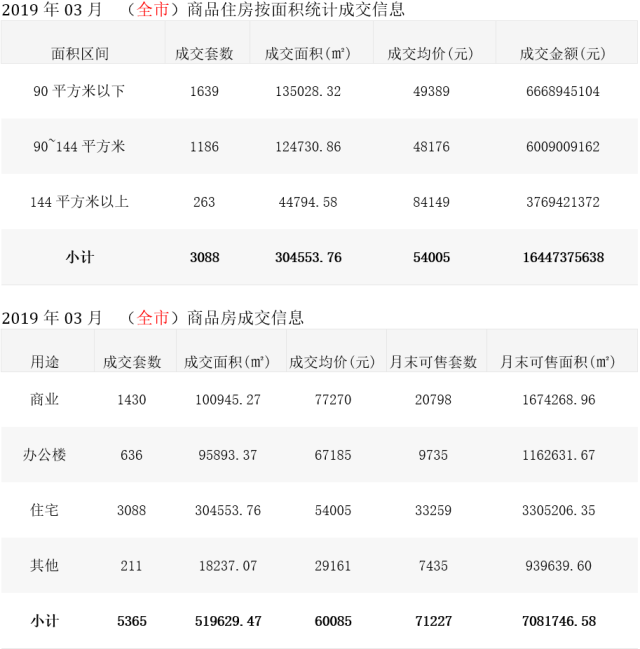 2019年3月深圳商品(住)房成交信息表