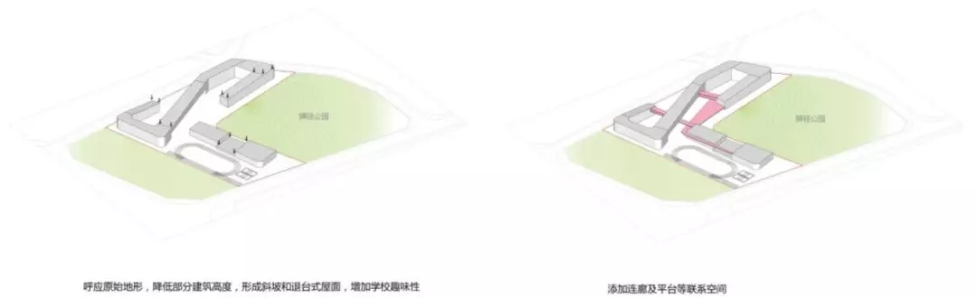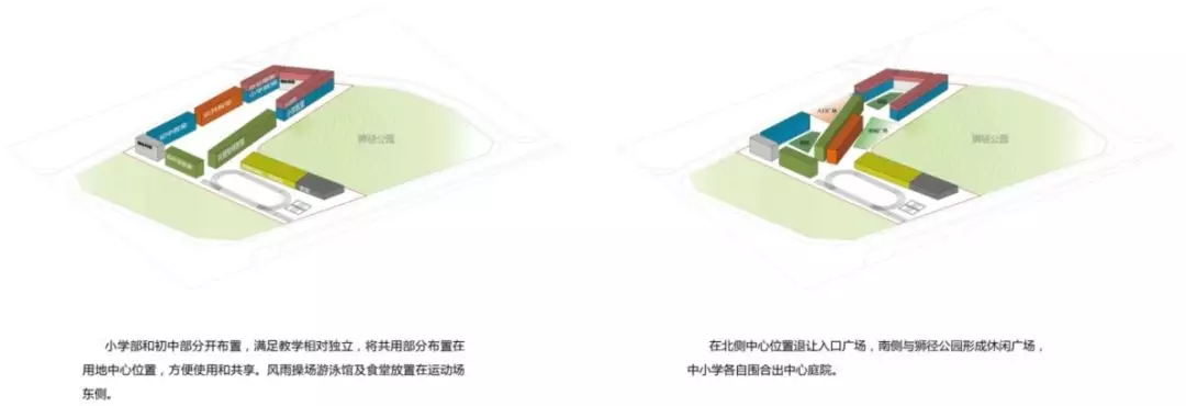 規(guī)劃采用了S型的布局關(guān)系,初中部和小學部各置一側(cè),各自有相對獨立的院落空間的同時,能夠照顧到空間的流通性,使得二者能夠方便地共享公共教學設(shè)施。