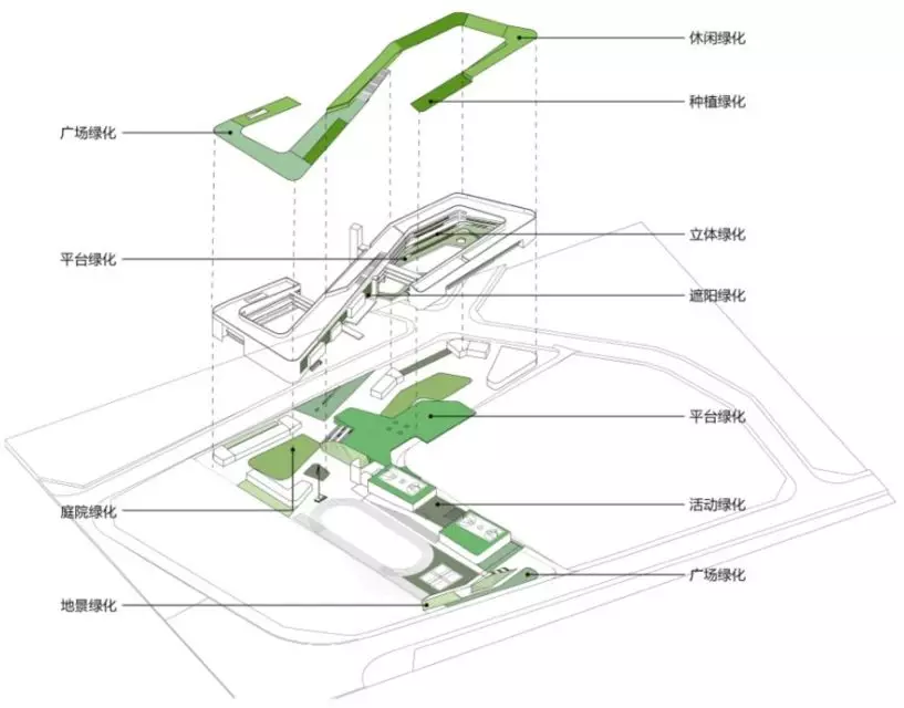 龍華區(qū)行知學校用地被西側的城市綠地、東南角的獅徑公園所包裹,具備天然的景觀優(yōu)勢。在內(nèi)部布局中,將場地、屋頂、架空層、立面結合起來,賦予多層次的綠化空間,打造真正的綠色校園。
