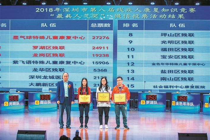 ▲2018深圳市第八屆殘疾人康復(fù)知識(shí)競(jìng)賽,王堅(jiān)為獲獎(jiǎng)單位代表頒獎(jiǎng)。