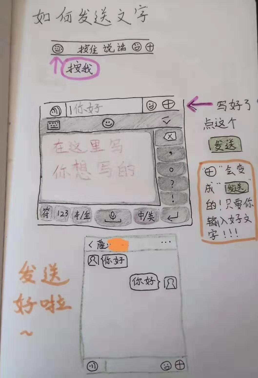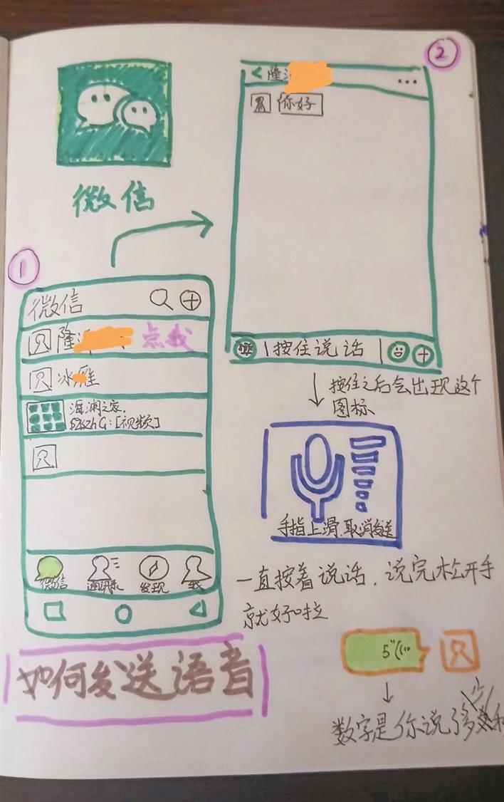 這是其侄女隆沂珊為了教會(huì)奶奶使用社交軟件特別畫的。圖文并茂地記錄了如何發(fā)送語音、如何發(fā)送文字等等,十分通俗易懂。