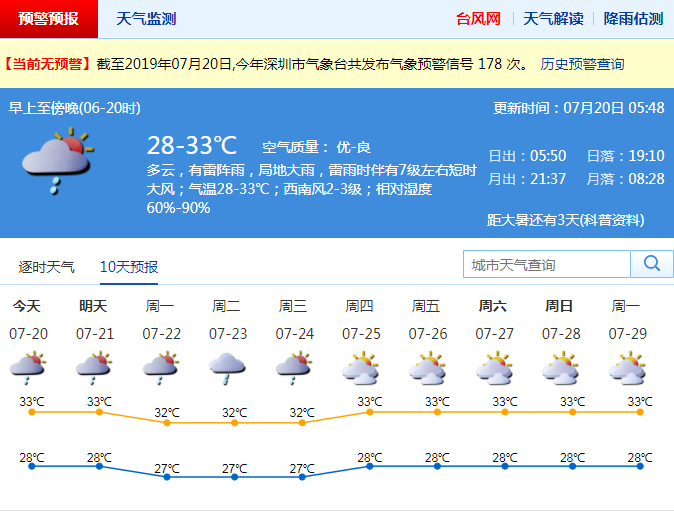 深圳新聞網(wǎng)2019年7月20日訊 昨日午后,我市出現(xiàn)中到大雨局部暴雨,并出現(xiàn)8-9級(jí)的短時(shí)大風(fēng)。深圳市氣象臺(tái)先后發(fā)布雷電、大風(fēng)藍(lán)色、暴雨黃色和分區(qū)暴雨橙色預(yù)警信號(hào)。這場雨帶來的降溫效果明顯,持續(xù)多日的高溫緩解,預(yù)警解除。
