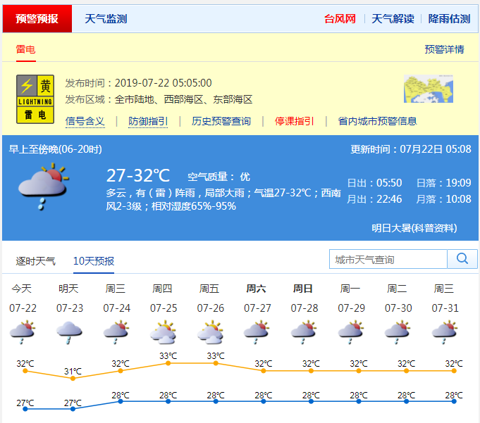 深圳新聞網(wǎng)2019年7月22日訊 炎熱與局地陣雨是近日深圳天氣的主題。據(jù)市氣象局預(yù)計(jì),未來(lái)兩天我市依然陽(yáng)光陣雨相伴,部分時(shí)間雨勢(shì)較大。其中,22日多云,有(雷)陣雨,局部大雨;27-32℃;西南風(fēng)2-3級(jí);濕度65%-95%。預(yù)計(jì)23-24日有(雷)陣雨,局部大雨;25-26日天氣炎熱,有局地短時(shí)陣雨。