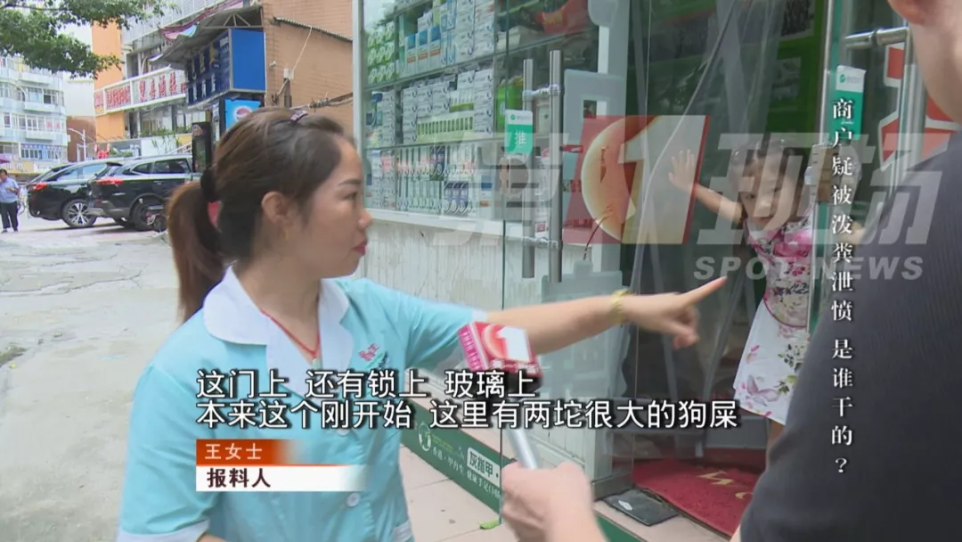 25日,記者來(lái)到了王女士店里發(fā)現(xiàn)門上、鎖上、玻璃上都粘了黏糊糊的東西,顏色是黃褐色的,還帶有一股味道,王女士說(shuō),這是狗屎(俗稱“黃金”),她已經(jīng)清理過(guò)一次了,原先還是很大的兩坨。