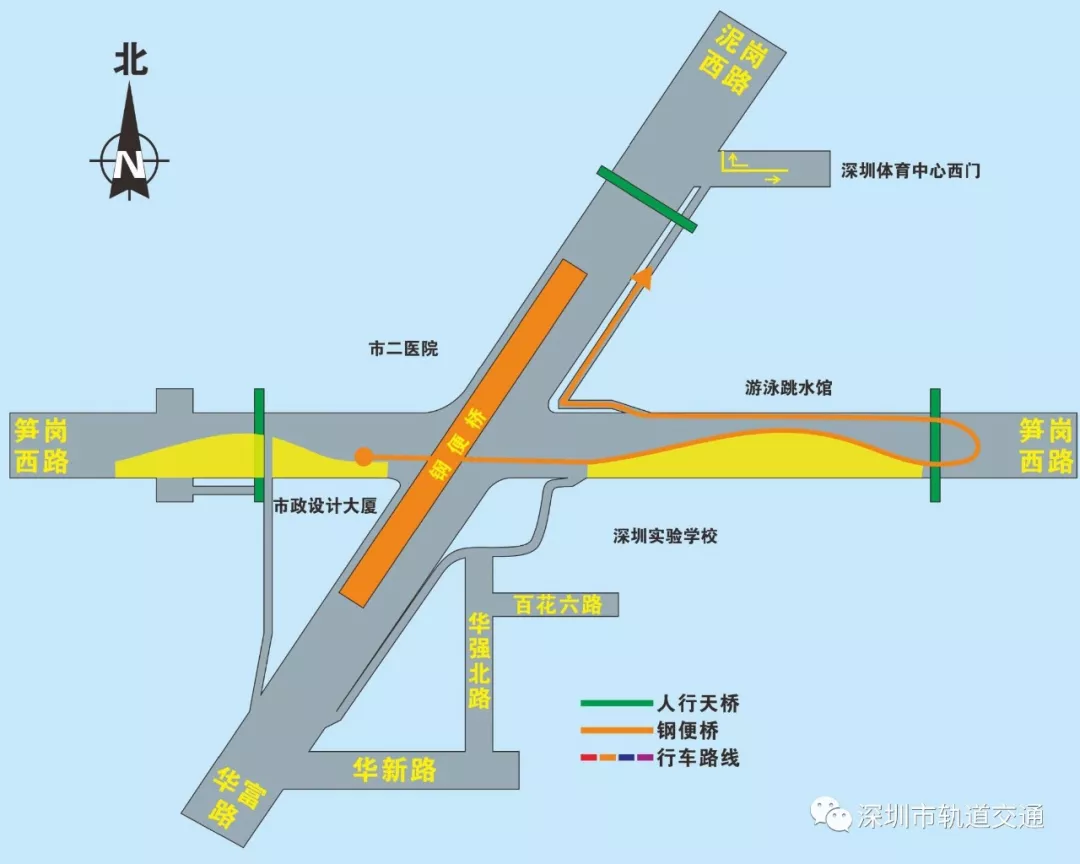 在本次調(diào)整中,華富路-泥崗西路南北向交通只能通過鋼便橋雙向六車道行車。泥崗西路、華富路、筍崗西路左轉(zhuǎn),行人線路及“市二醫(yī)院”,“體育館”公交站臺(tái)均有所調(diào)整。