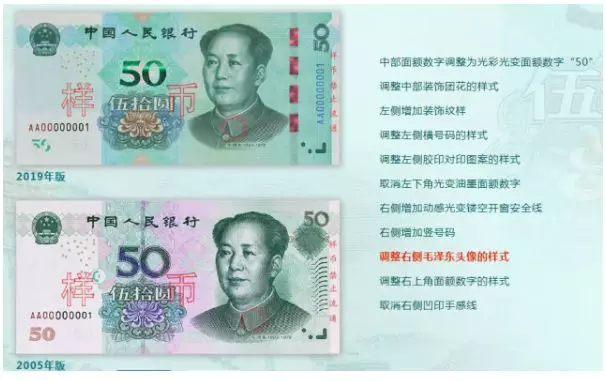2019年版第五套人民幣50元、20元、10元、1元紙幣分別保持2005年版第五套人民幣50元、20元、10元紙幣和1999年版第五套人民幣1元紙幣規(guī)格、主圖案、主色調(diào)、“中國人民銀行”行名、國徽、盲文面額標記、漢語拼音行名、民族文字等要素不變,提高了票面色彩鮮亮度,優(yōu)化了票面結(jié)構(gòu)層次與效果,提升了整體防偽性能。2019年版第五套人民幣50元、20元、10元、1元紙幣調(diào)整正面毛澤東頭像、裝飾團花、橫號碼、背面主景和正背面面額數(shù)字的樣式,增加正面左側(cè)裝飾紋樣,取消正面右側(cè)凹印手感線和背面右下角局部圖案,票面年號改為“2019年”。