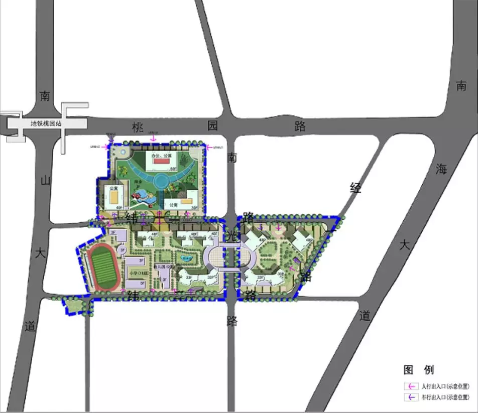 項(xiàng)目將采取TOD模式(以公共交通為導(dǎo)向的開發(fā)模式)開發(fā),計(jì)劃將居住、商業(yè)、辦公和公共空間解決在600米之內(nèi)的范圍。該項(xiàng)目由1棟60F寫字樓公寓、2棟30F-40F公寓、9棟33F-48F超高層住宅以及1所18班小學(xué)、1所9班幼兒園組成。