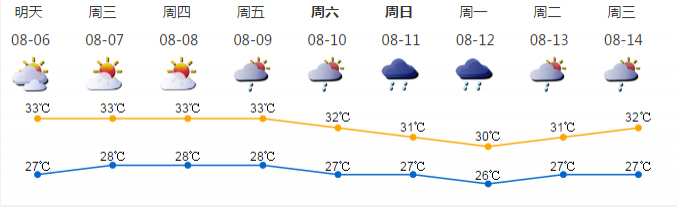 根據(jù)天氣預(yù)報,未來一周天氣以晴天為主,9號 -14號將有降雨,但氣溫依然是維持在30°C以上,最高氣溫達到33°C。