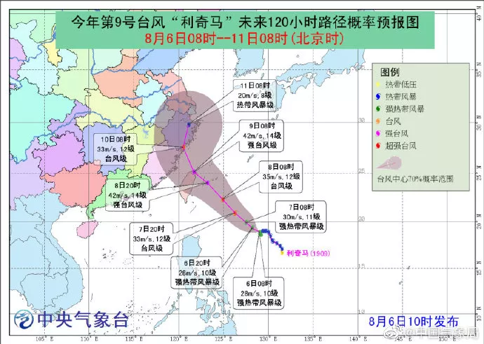 預(yù)計,“利奇馬”將以每小時5公里左右的速度緩慢向西北方向移動,強度逐漸增強,最強可達臺風級或強臺風級(12-14級,35-45米/秒),逐漸向我國東南沿海靠近。未來兩天對我國近海海域無影響。