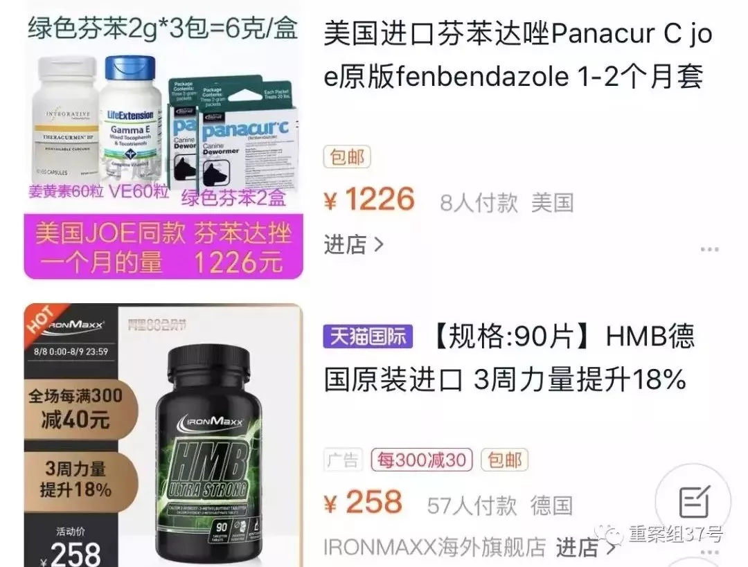 事情發(fā)展到現(xiàn)在,已經(jīng)有人在網(wǎng)上做起這門生意。在電商平臺(tái)搜索可見,不少商家打出“喬伊套餐”等招牌售賣芬苯達(dá)唑,自稱是按美國(guó)患者喬的配方搭配,但如此一來,原本20多元一瓶的藥,搭配后就要賣800元左右。