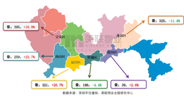 各區(qū)具體成交量及環(huán)比增減幅度差異明顯。其中龍崗成交233套,雖環(huán)比下降12.4%,但總量仍居全市首位;寶安成交162套,位居全市第二位,成交量環(huán)比下降25.3%。此外,龍華和光明并列成為上周一手住宅成交量環(huán)比上升幅度最大的區(qū)域,均增長(zhǎng)1.6倍,分別增至74和62套。而羅湖區(qū)盡管成交套數(shù)也大幅增長(zhǎng)達(dá)1倍,但是羅湖區(qū)新房較少,即使增長(zhǎng)一倍也僅有6套成交。