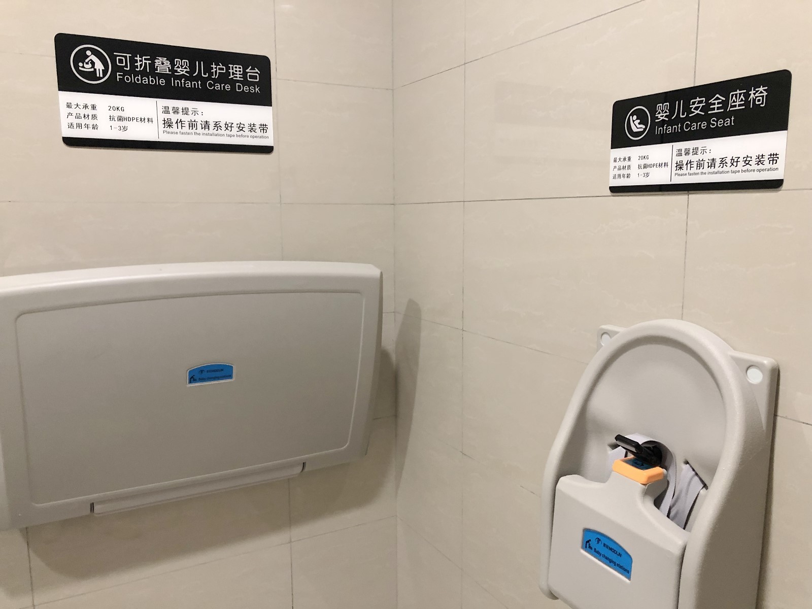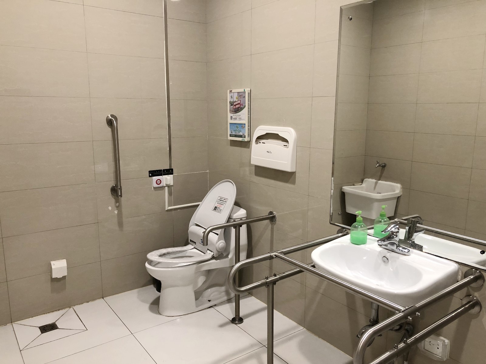 ▲在靠近福田高鐵站方向的另一處洗手間,記者在殘疾人洗手間的門上看到了第三衛(wèi)生間圖案標(biāo)識。推門進入,里面除了設(shè)有帶扶手、供殘疾人使用的成人坐便器和洗手池之外,還有可折疊的嬰兒護理臺和嬰兒安全座椅,這顯然是一間將母嬰室、殘疾人洗手間“二合一”的洗手間,但沒有第三方洗手間配置所要求的兒童坐便器。