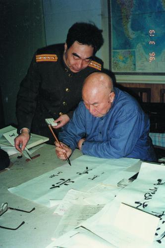 ▲1996年軍旅作家吳東峰(左)到開國上將肖克(右)家中采訪時,蕭克將軍在他墨香陣陣的書房內(nèi)給他寫下‘求實’兩個大字。