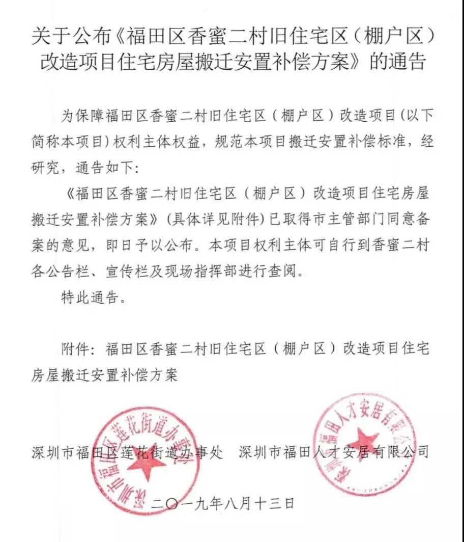 晶報2019年8月19日訊 8月13日,深圳市福田區(qū)蓮花街道辦事處和深圳市福田人才安居有限公司聯合發(fā)布"關于公布《福田區(qū)香蜜二村舊住宅區(qū)(棚改區(qū))改造項目住宅房屋搬遷安置補償方案》的通告"。