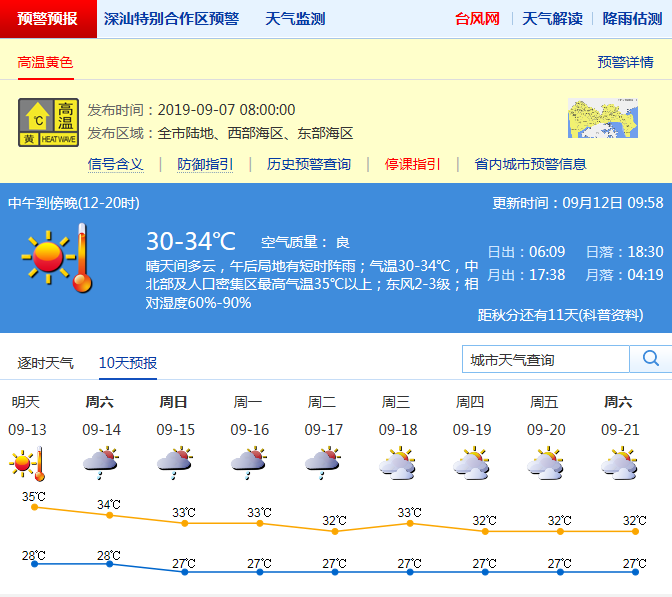見圳客戶端·深圳新聞網(wǎng)2019年9月12日訊 深圳氣象局預(yù)計(jì)12日晴天間多云,天氣炎熱,局部有短時雷陣雨;氣溫28-34℃,中北部或人口密集區(qū)最高氣溫35℃以上;東風(fēng)2-3級;相對濕度60%-90%。13日晴到多云,局部有短時雷雨;14-17日多云,有雷陣雨,高溫天氣逐漸緩解。