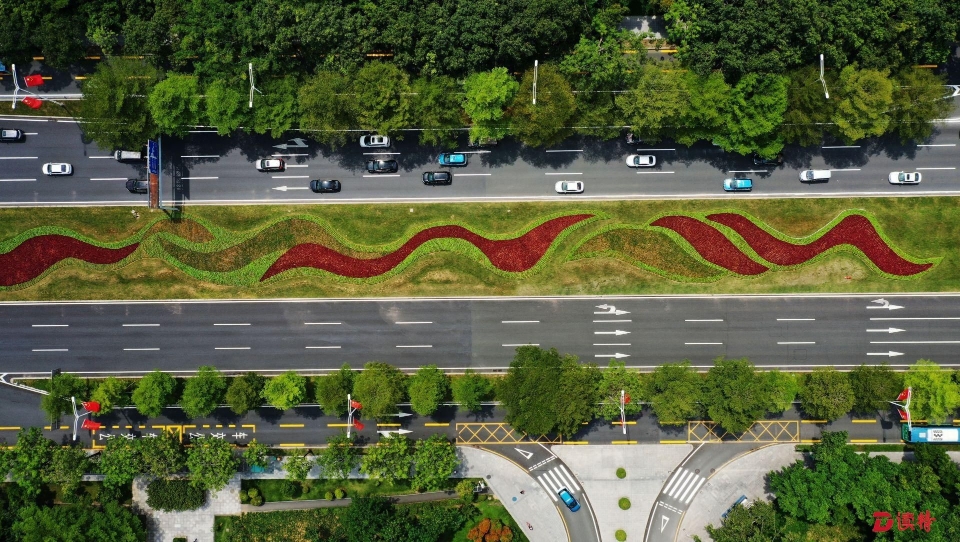 車輛行駛在深南大道上,沿路多處可以看到綠化工人們正在綠化帶上忙碌著,種植鮮花,修剪草坪,澆水養(yǎng)護(hù)。深南大道東段中間帶上,大紅色的赤壁,搭配藍(lán)色、粉色的大花香彩雀以及白里透粉的夏堇,共同組成了流線型的“鳳凰飛羽”圖案造型。從高處看去,綠化帶與兩側(cè)路燈上懸掛的鮮艷的國旗交相輝映,濃濃的節(jié)日氣息撲面而來。