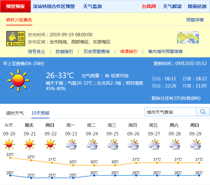 見圳客戶端·深圳新聞網2019年9月20日訊 深圳市氣象局預計氣溫26-33℃;東北風2-3級;相對濕度50%-80%。 21-22日持續(xù)晴天干燥;23-26日以多云為主。