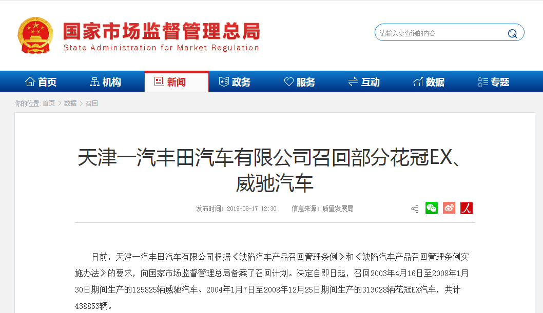 見(jiàn)圳客戶(hù)端·深圳新聞網(wǎng)2019年9月20日訊 9月17日,豐田汽車(chē)(中國(guó))投資有限公司、天津一汽豐田汽車(chē)有限公司先后發(fā)布三次召回計(jì)劃,宣布召回旗下豐田、雷克薩斯兩大品牌共計(jì)454017輛汽車(chē)。本次召回的問(wèn)題車(chē)輛既包括一汽豐田旗下的威馳、花冠EX轎車(chē),也包含了高端品牌雷克薩斯旗下的IS系列、SC430豪華車(chē)型。