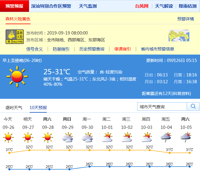 由于近期大氣層結(jié)靜穩(wěn),深圳持續(xù)受偏北下沉氣流控制,近地面風(fēng)力微弱且中西部地區(qū)出現(xiàn)局地風(fēng)向輻合,氣象條件不利于污染物擴(kuò)散,25日下午中西部地區(qū)出現(xiàn)了輕微到輕度灰霾;預(yù)計(jì)入夜后,能見度將逐漸好轉(zhuǎn)。26-30日深圳晴天到多云為主,空氣干燥。26日氣溫25-31℃,陽(yáng)光充足;展望10月初晴朗干燥天氣持續(xù)。森林火險(xiǎn)預(yù)警持續(xù)生效中。