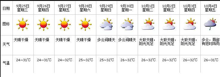 據(jù)市氣象局預(yù)計(jì),國(guó)慶假期前半段天氣整體晴好 ,看到這一排小太陽(yáng)超開心的有木有?!