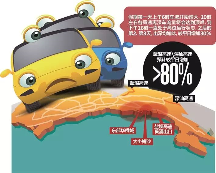 ⑩深圳交警預測全市從9月30日下午開始交通流量加大,9月30日、10月1日出行量達到頂峰。各高速公路、市內各景點、商圈、購物點以及東部景區(qū)會出現(xiàn)不同程度的擁堵,全市各區(qū)羅湖區(qū)最為擁堵,其次是福田區(qū)、南山區(qū)。預計‘國慶’期間,全市出深和入深車輛總數(shù)均將超過170萬輛。