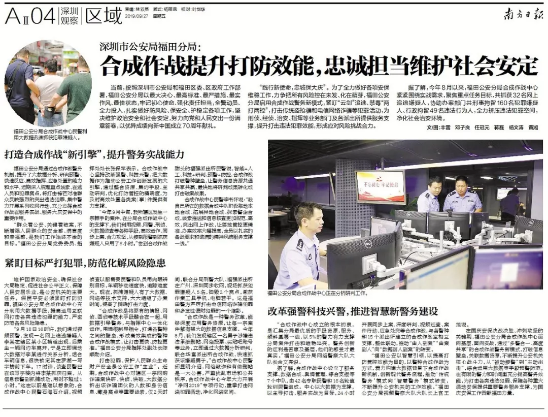 在大慶安保決戰(zhàn)決勝、沖刺攻堅(jiān)的關(guān)鍵期,福田公安分局合成作戰(zhàn)中心面向基層、面向?qū)崙?zhàn),通過“多警合一、高度共享”的合成作戰(zhàn)警務(wù)新模式,打破信息壁壘,關(guān)聯(lián)數(shù)據(jù)資源,不斷提升公安機(jī)關(guān)核心戰(zhàn)斗力,從“被動(dòng)接警”到“主動(dòng)出擊”,綜合運(yùn)用大數(shù)據(jù)等手段預(yù)警防范,為在有限的警力和時(shí)間里充分提高警務(wù)效能,為打擊各類違法犯罪、保障各種重大活動(dòng)安保提供重要警務(wù)服務(wù)支撐,為大慶安保工作貢獻(xiàn)福田力量。
