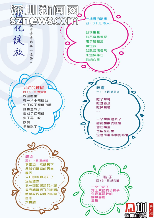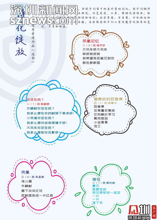 編委會的老師感慨,《童詩鳳凰》這本詩集是扎根于詩意校園的土壤結(jié)出的詩花。是鳳凰的孩子們在荷塘邊、在草莓地、在蘑菇亭、在好玩的地方用心聆聽大自然后,最真實(shí)最動人的表達(dá)。
