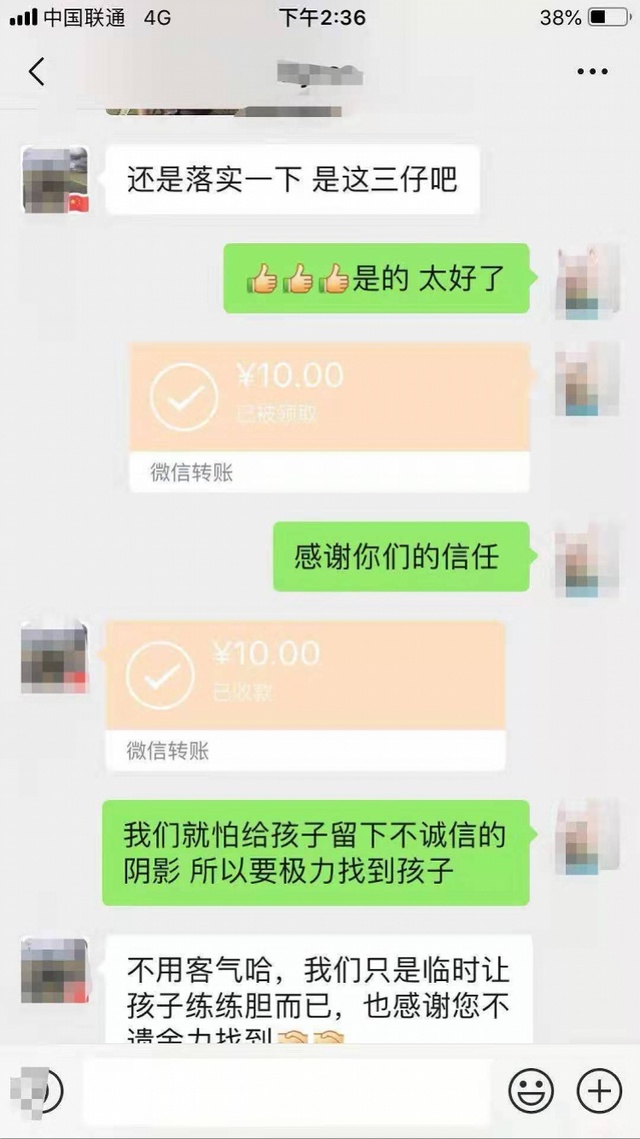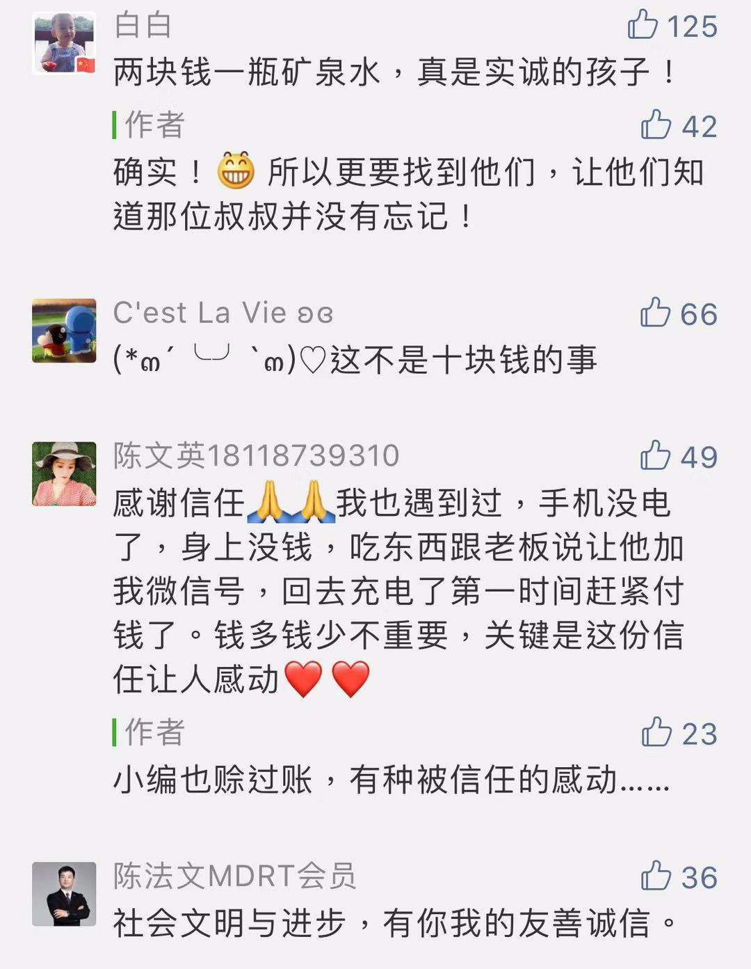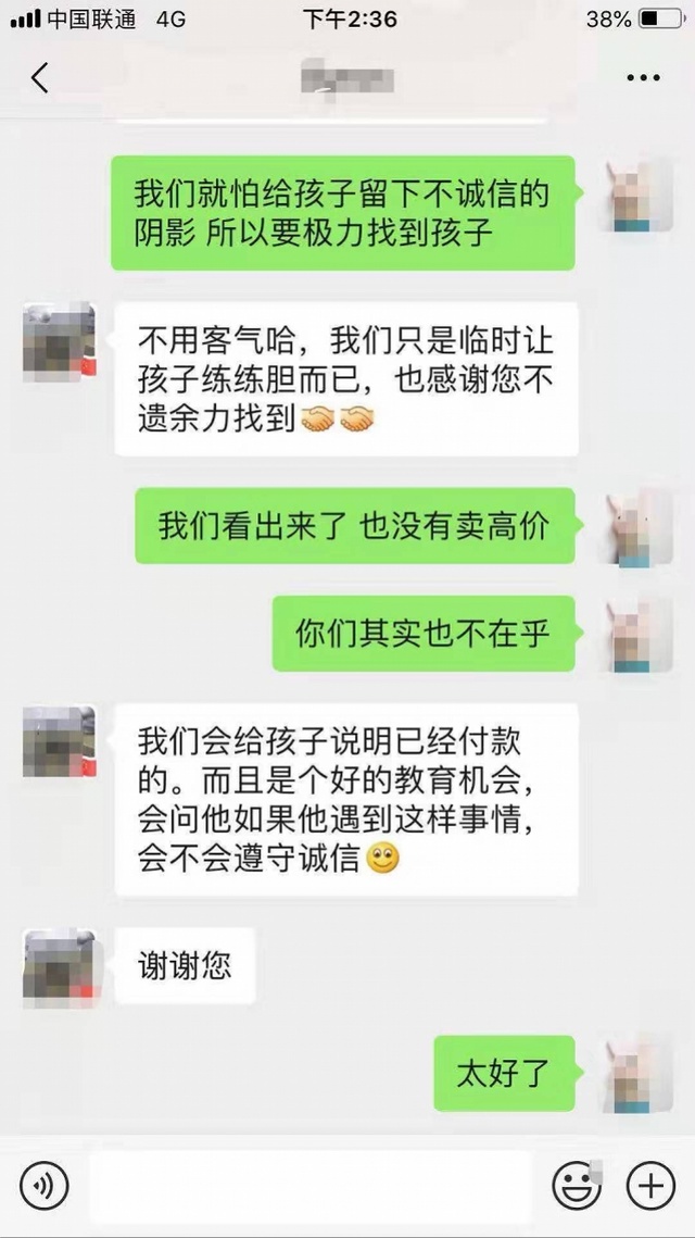 賣(mài)水男孩爸爸告訴張先生,他是從朋友的轉(zhuǎn)發(fā)中,看到這個(gè)消息的。他介紹說(shuō),他們那天只是臨時(shí)讓孩子練練膽,并對(duì)張先生努力尋找孩子,實(shí)現(xiàn)對(duì)孩子承諾的誠(chéng)信行為表示感謝?!拔視?huì)給孩子說(shuō)明已經(jīng)付款的,而且這是個(gè)好的教育機(jī)會(huì),我會(huì)問(wèn)他,如果他遇到這樣的事情,會(huì)不會(huì)遵守誠(chéng)信?!辟u(mài)水男孩爸爸告訴張先生,“沒(méi)有想到你為了守護(hù)一份誠(chéng)信,借助網(wǎng)絡(luò)媒體的力量,花大力氣尋找并支付礦泉水錢(qián),這份堅(jiān)持,讓我們和孩子都非常感動(dòng)。我們也已經(jīng)與孩子溝通整件事情,并借此機(jī)會(huì)告訴他換位思考,如果遇到類(lèi)似情況,也應(yīng)堅(jiān)持誠(chéng)信、與人為善的傳統(tǒng)美德。”
