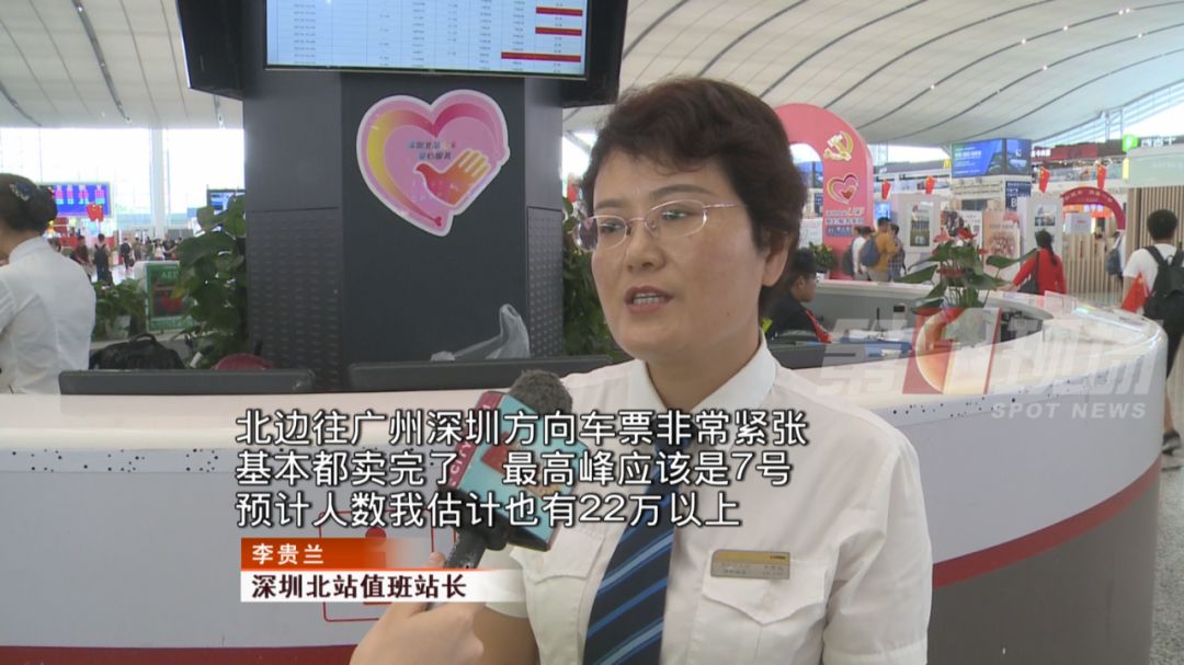 深圳北站值班站長表示,北站已進入客流返程高峰,到達旅客今天將達24萬人次,10月7日大部分來往廣深兩地的車票都已售罄,預計客流返程最高峰將出現(xiàn)在10月7號。
