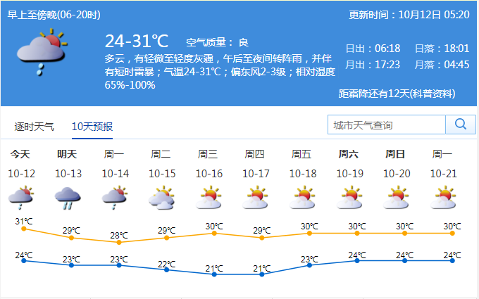 見圳客戶端·深圳新聞網(wǎng)2019年10月12日訊 據(jù)深圳市氣象臺(tái)消息,今日深圳多云,有輕微至輕度灰霾,午后至夜間轉(zhuǎn)陣雨,并伴有短時(shí)雷暴;氣溫24-31℃;偏東風(fēng)2-3級(jí);相對(duì)濕度65%-100%