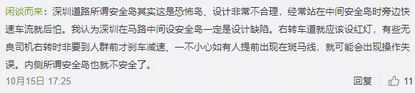 那么,安全島能不能做到相對(duì)更安全呢。目前深圳很多安全島闊度低于1.5米的國(guó)際安全標(biāo)準(zhǔn),一旦難以容納等候過(guò)路的行人,車流就會(huì)對(duì)行人構(gòu)成威脅,是不是可以建的更大一些。另外,安全島是不是可以建得更結(jié)實(shí)。不敢說(shuō)一定要能抵擋泥頭車大貨車的洶洶氣勢(shì),至少一般的小汽車如果出現(xiàn)“航向偏差”,我們的安全島可以有效緩沖甚至阻停。