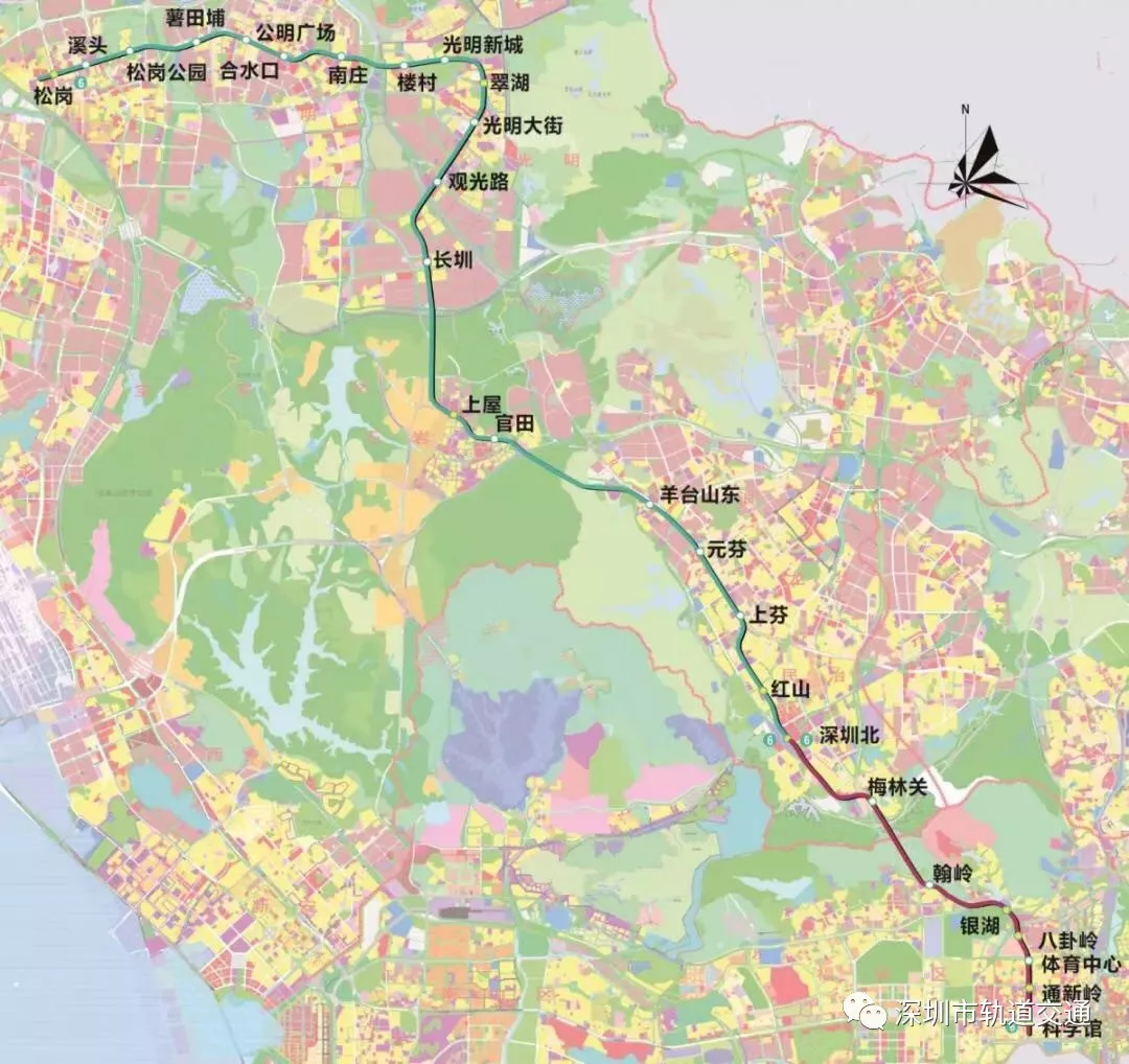 站點:科學館、通新嶺、體育中心、八卦嶺、銀湖、翰嶺、梅林關、深圳北、紅山、上芬、元芬、羊臺山東、官田、上屋、長圳、觀光路、光明大街、翠湖、光明新城、樓村、南莊、公明廣場、合水口、薯田埔、松崗公園、溪頭、松崗