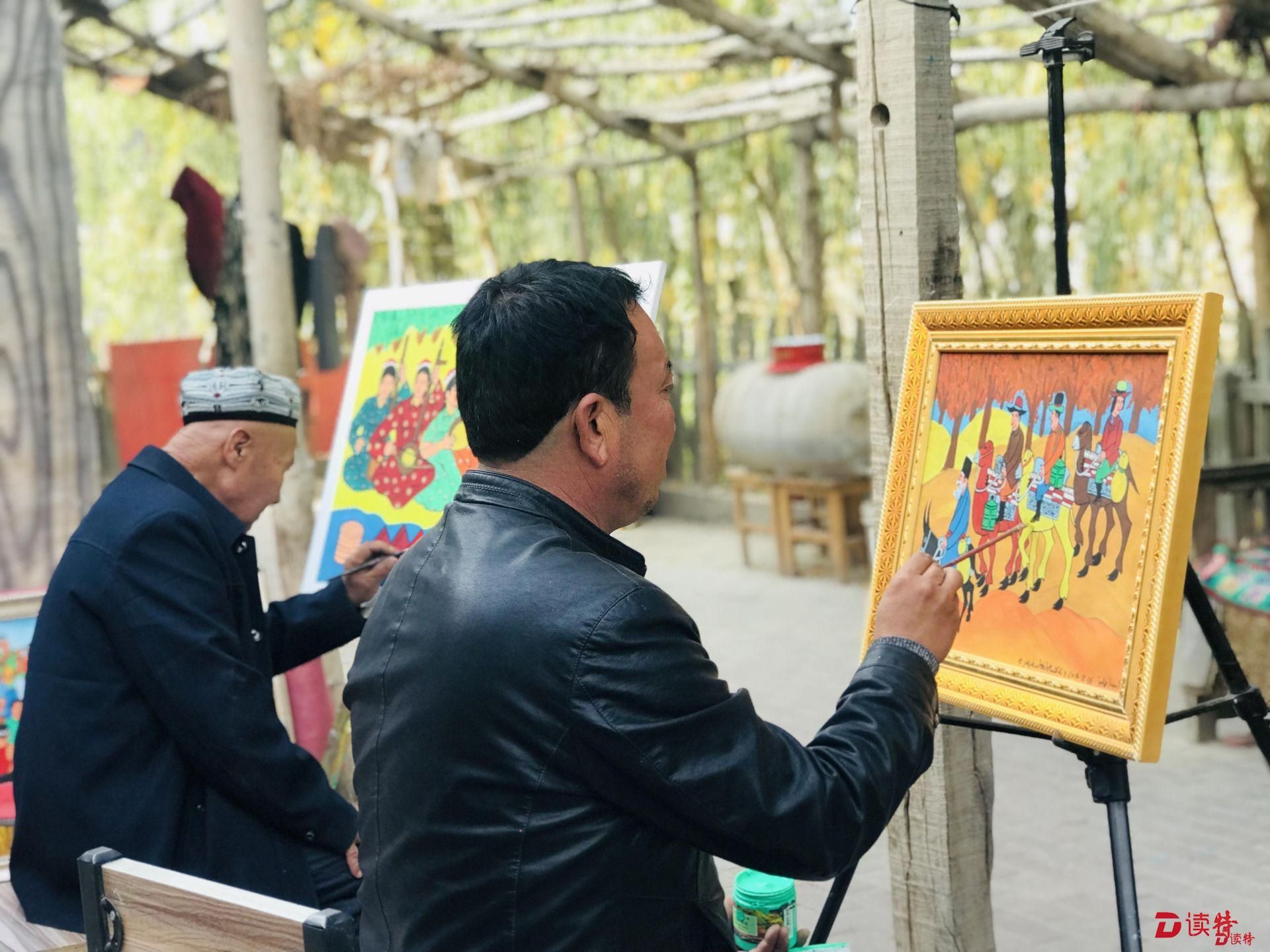 國家級農(nóng)民畫畫家木卡熱埔江·艾海提告訴記者記者,他現(xiàn)在一年有將近45000元的收入,一部分來自于在安居房上畫農(nóng)民畫,一年有30000塊錢的收入,另一部分是自己賣出的畫,一年能掙15000。“現(xiàn)在麥蓋提旅游的人多了,看到他們喜歡我的畫,我感到很高興,現(xiàn)在越畫越有勁了!”聊起麥蓋提的發(fā)展,木卡熱埔江的臉上難掩喜悅。