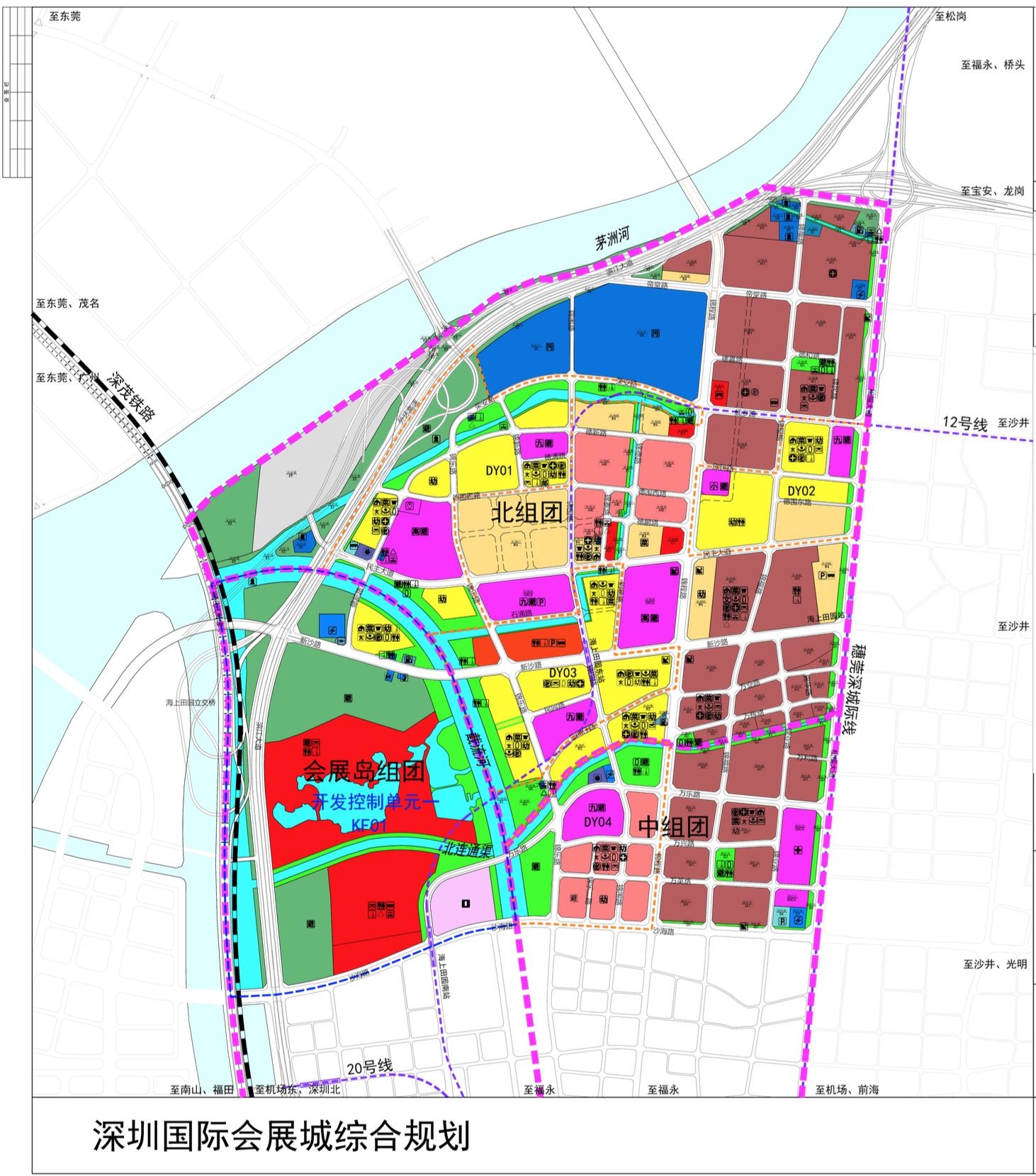 “深圳國際會展城”范圍北抵茅洲河、東至松福大道、南臨福永河、西側(cè)主要以廣深沿江高速公路為界,并包括規(guī)劃寶安綜合港區(qū),范圍共計22.57平方公里,規(guī)劃區(qū)劃分為三個片區(qū):國際會展中心片區(qū)、海上田園片區(qū)和寶安綜合港區(qū)。