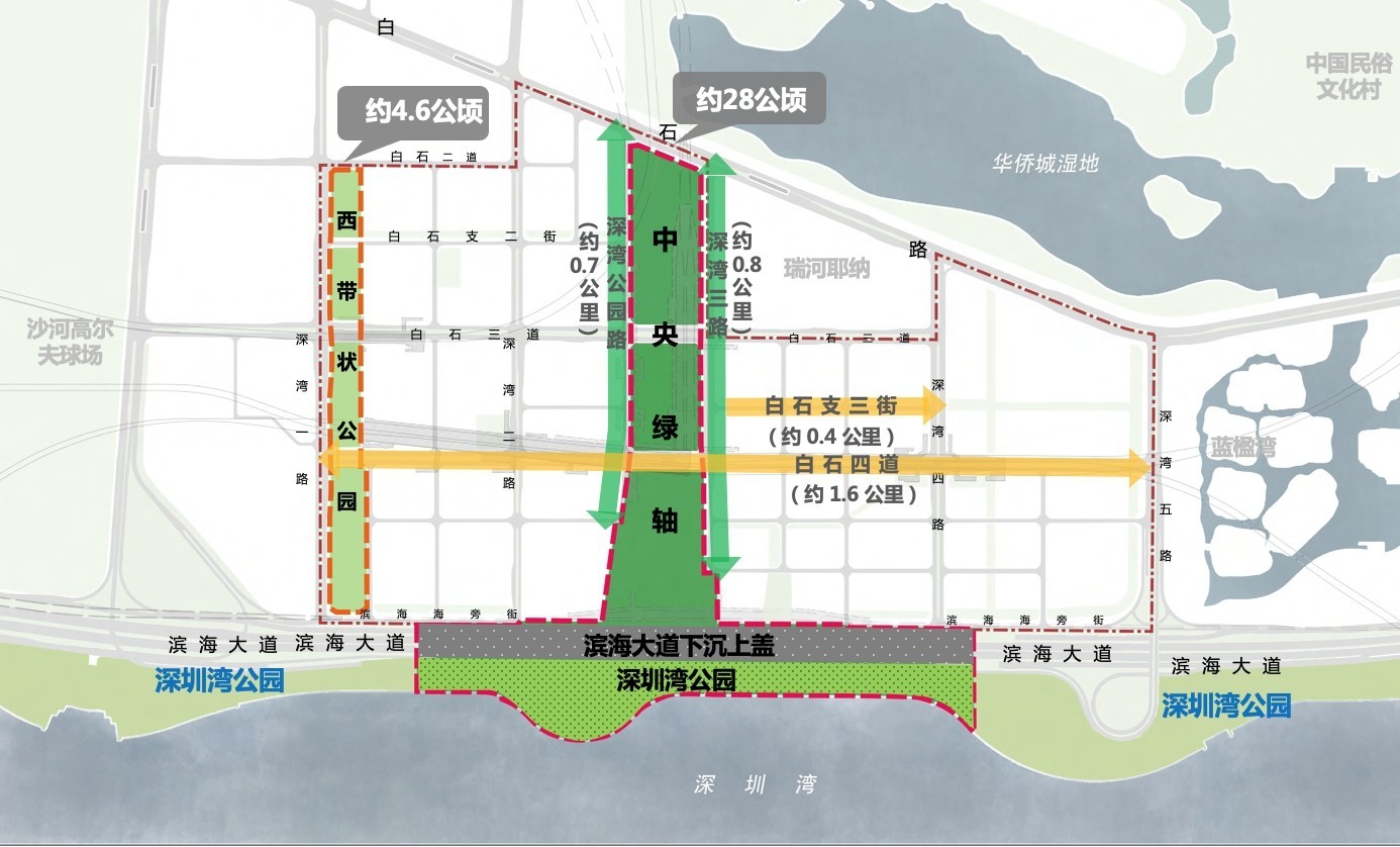 國際咨詢的重點設計范圍為中央綠軸(約28公頃,含濱海大道下沉上蓋和深圳灣公園部分區(qū)域)(含深灣公園路、深灣三路街道空間)、片區(qū)重要街道(白石四道、白石支三街)、西帶狀公園(約4.6公頃)等。