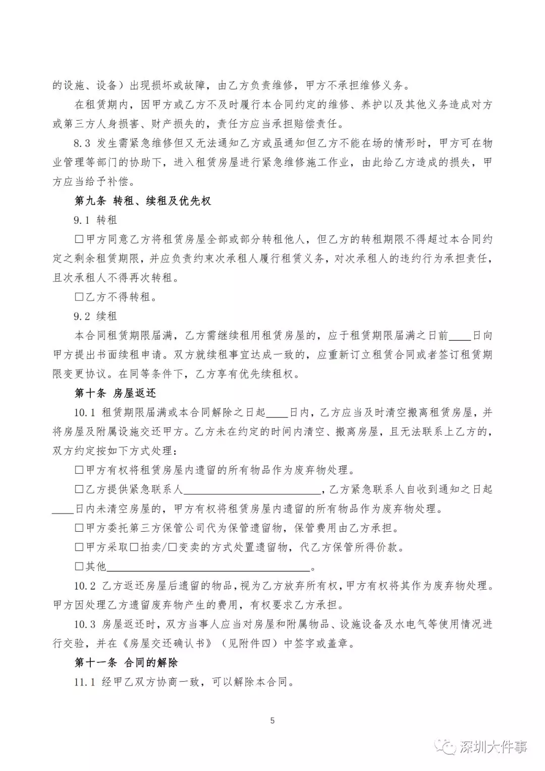 5、住宅租賃合同中,增加了通過深圳市住房租賃監(jiān)管服務平臺辦理合同登記備案的方式,逐步引導當事人進行網(wǎng)上備案;