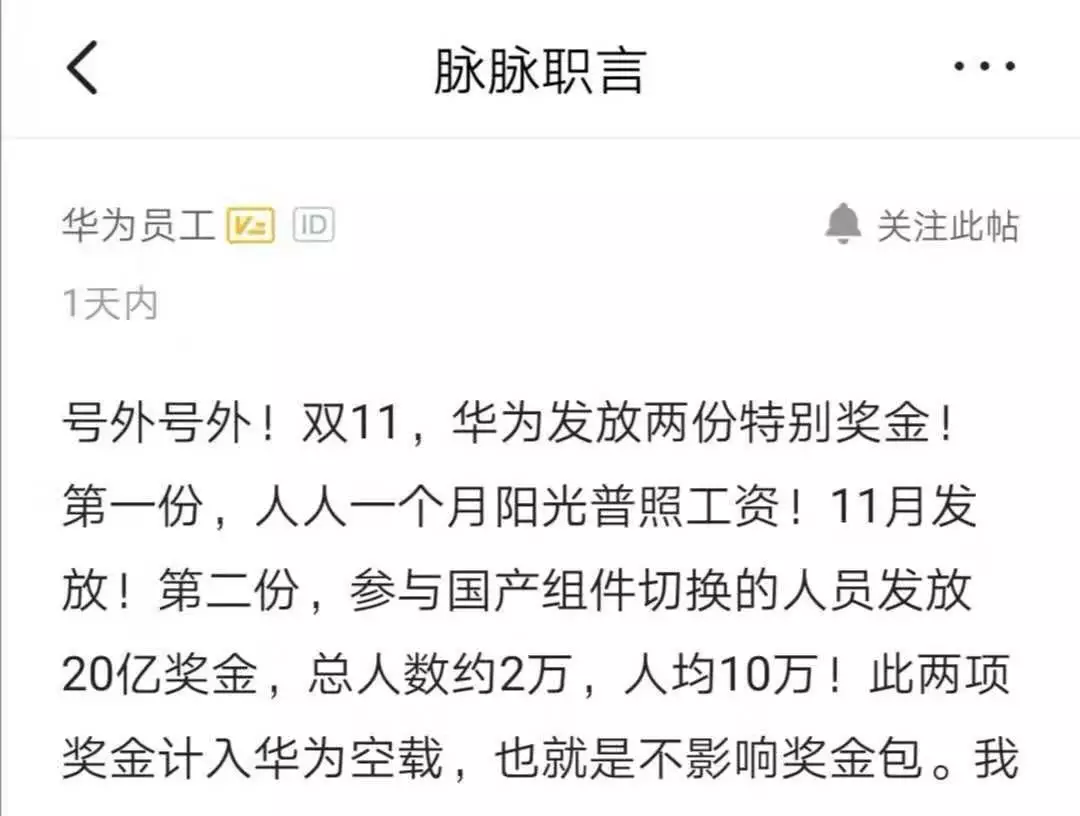 還有網(wǎng)友表示,“20億是只獎勵大概兩萬人,針對的是把美國零部件替換成華為自己零部件的研發(fā)崗位人員,其他所有華為正式員工,包括上面的兩萬多人,獎勵一個月工資,工資參考的10月份的工資,年終獎不受影響?!?/p>