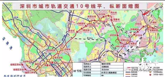 地鐵10號(hào)線(xiàn),南連與香港毗鄰的福田口岸站,北接龍崗區(qū)雙擁街,線(xiàn)路全長(zhǎng)約29公里,共設(shè)車(chē)站24座。