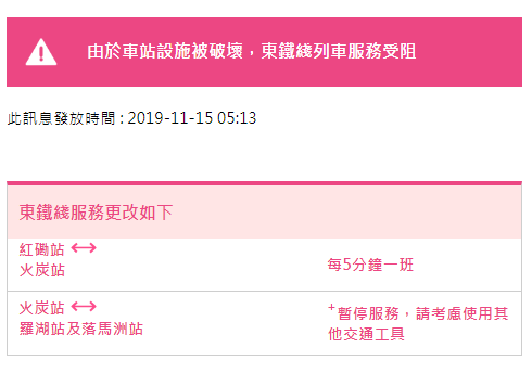 港鐵于今早05:05發(fā)布通告稱,港鐵各線列車服務(wù)延誤或受阻,經(jīng)詳細(xì)風(fēng)險(xiǎn)評估及相關(guān)政府部門商討后,港鐵各線(機(jī)場快線除外)、輕鐵及港鐵巴士的服務(wù)將于晚上10時(shí)結(jié)束。由頭班車起,東鐵線大學(xué)至羅湖及落馬洲站暫時(shí)關(guān)閉,列車也不停相關(guān)車站。