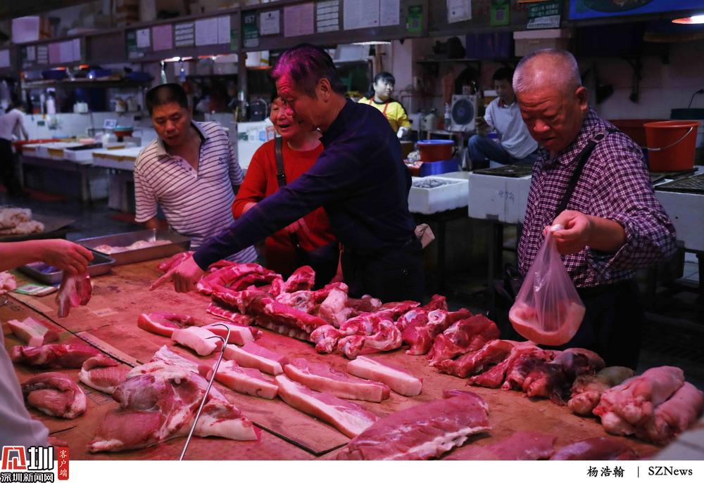 2019年11月18日,福田農(nóng)批市場(chǎng),三位正在選購豬肉的市民。