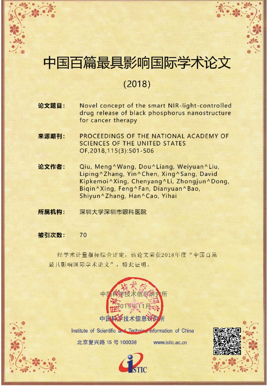 深圳特區(qū)報(bào)2019年11月22日訊 11月19日,中國科學(xué)技術(shù)信息研究所在北京召開中國科技論文統(tǒng)計(jì)結(jié)果發(fā)布會(huì),公布了2018年中國百篇最具影響國際學(xué)術(shù)論文。深圳大學(xué)張晗教授課題組2篇論文入選,深大入選數(shù)量在中國內(nèi)地高校和研究機(jī)構(gòu)中并列第10。