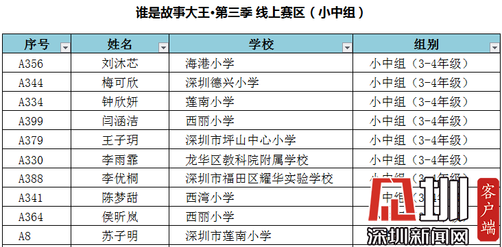 附:“誰(shuí)是故事大王·第三季”-線上賽區(qū)晉級(jí)深圳市復(fù)賽名單