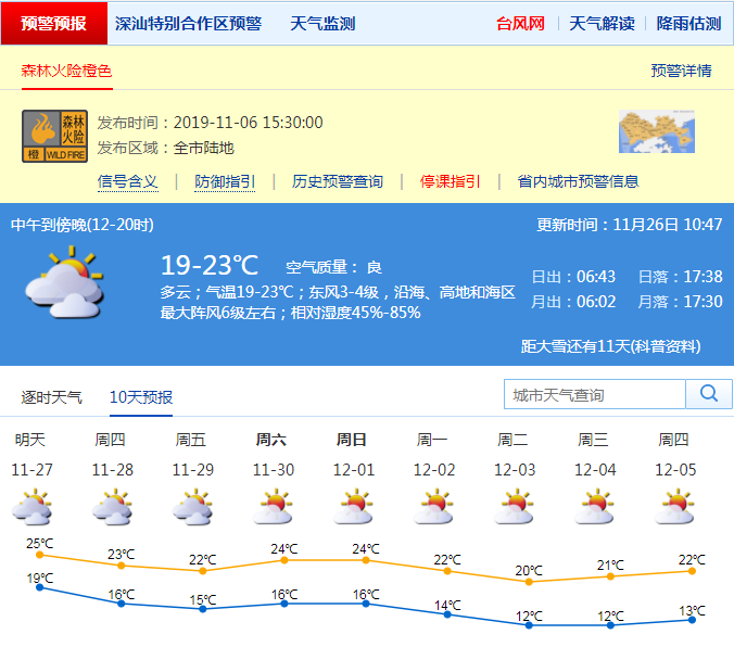 見圳客戶端·深圳新聞網(wǎng)2019年11月26日訊 記者從市氣象臺獲悉,26日多云,氣溫19-23℃;27日晴間多云,空氣干燥,早晚清涼,夜間新一股空氣開始影響我市。