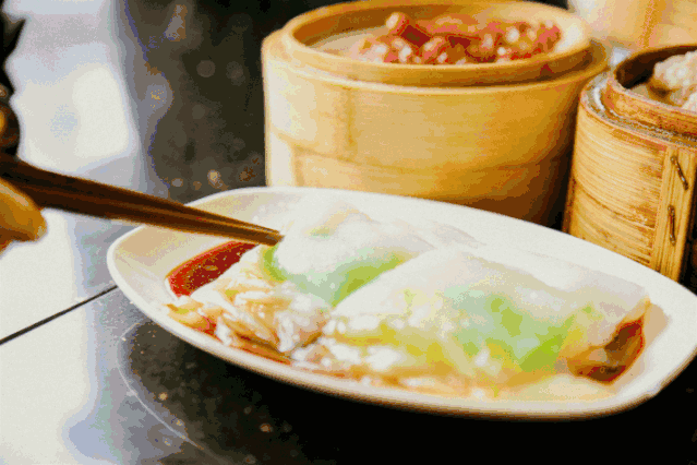 當(dāng)天還灰蒙蒙,大地還在沉睡之時(shí),氤氳的水蒸氣便在賣腸粉的小店彌漫升騰,那是開啟一天忙碌的訊號(hào)。用米漿和蔬菜肉末雞蛋等等一起,在一格格的小抽屜里面蒸熟,再將特制的醬料淋上(喜辣的還可以加上辣椒),一道美味就此誕生。