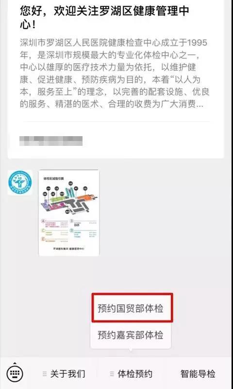 首先,關注公眾號“羅湖醫(yī)院集團健康管理中心”,進入公眾號點擊菜單欄“預約國貿(mào)部體檢”。