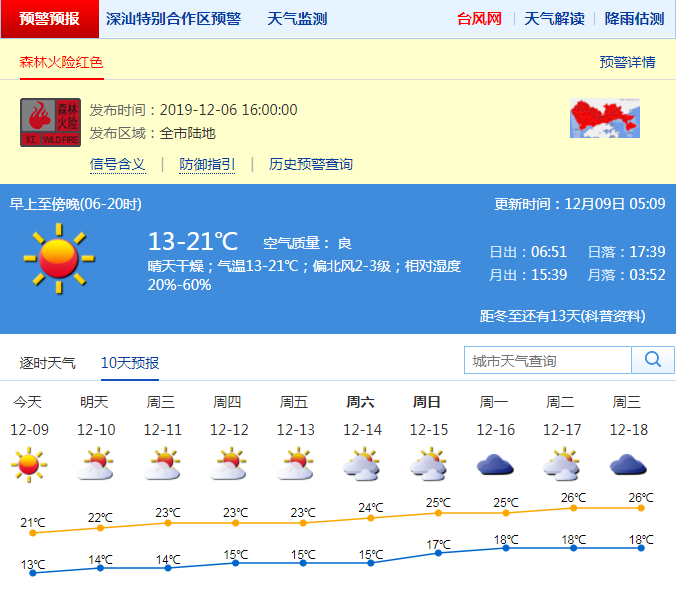 今日起氣溫逐日回升。深圳市氣象臺預測,9-11日晴天間多云,空氣非常干燥,氣溫逐日小幅度回升;12-13日晴天間多云,空氣干燥;14-16日,云量增多,濕度增大,氣溫繼續(xù)回升。天氣持續(xù)干燥,請注意用火安全。